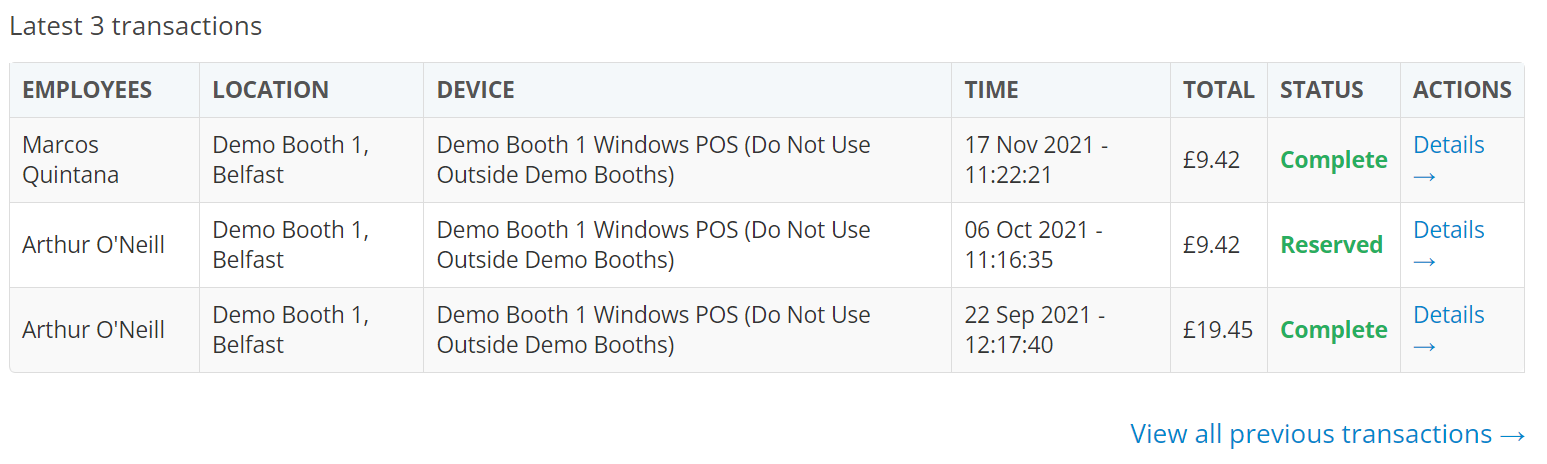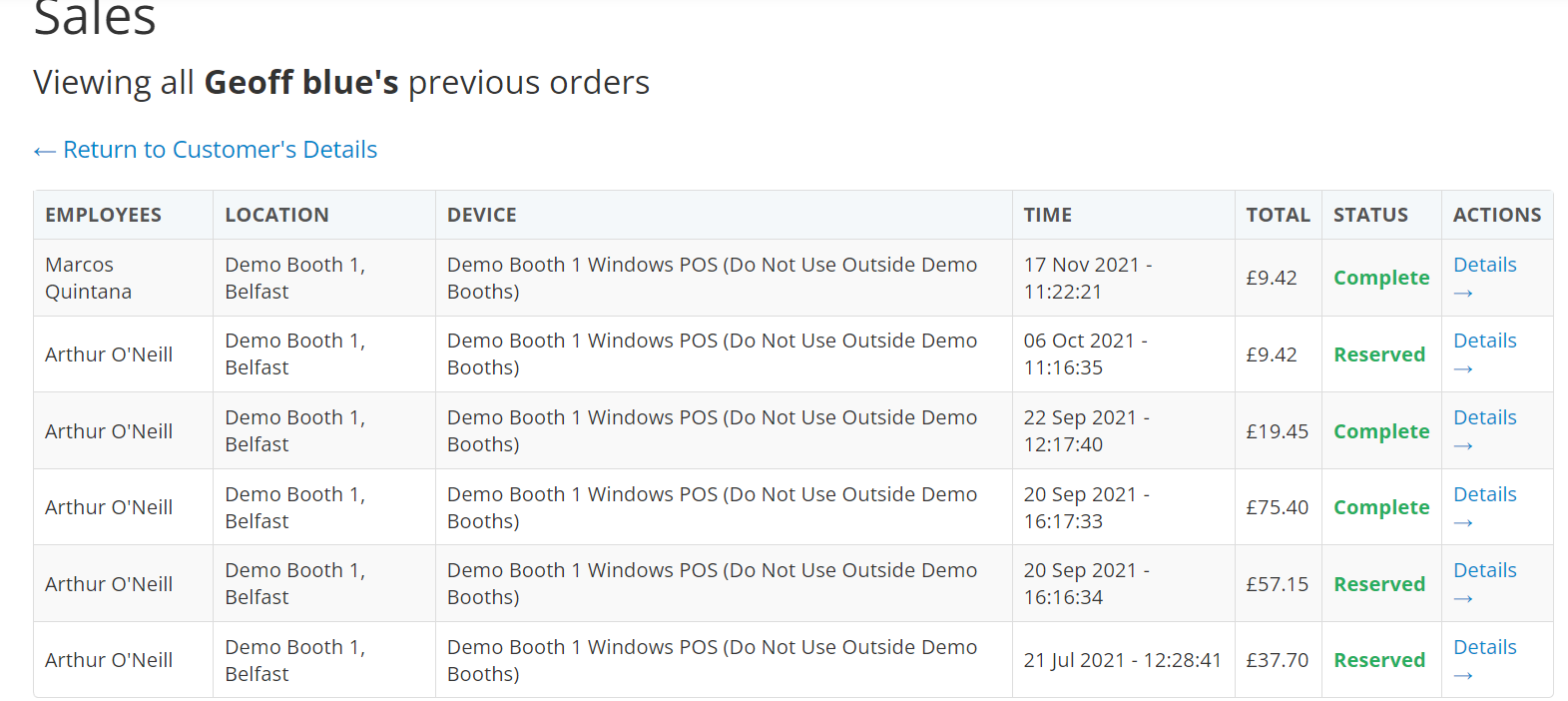 You will then be presented with a comprehensive list of all transactions that have taken place since the creation of this customer account. For further details on each transaction, click the 'Details' button under the 'Action' column in the table.