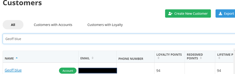 Utilize the search bar to find the customer whose transaction history you wish to view. Let's use 'Geoff Blue' as an example.