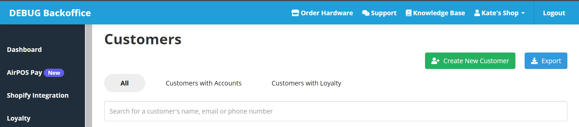 Log into your AirPOS Backoffice account and navigate to the customer page using this link: https://backoffice.airpointofsale.com/customers.