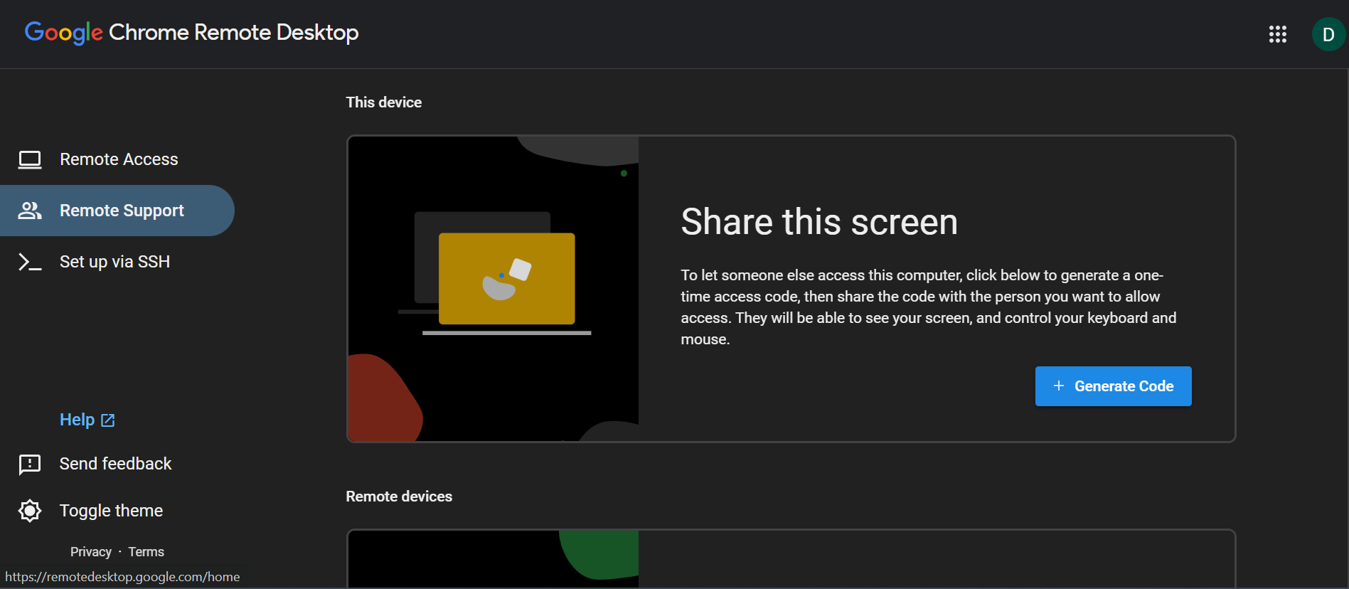 After adding the extension, go back to the original "Google Remote Access" page. You should now see an option to "Generate Code."