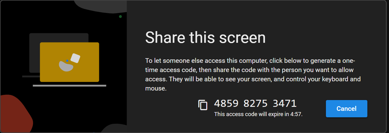 After the support member enters the code on their side, you will receive a notification asking for permission to share your screen and allow control of your device.