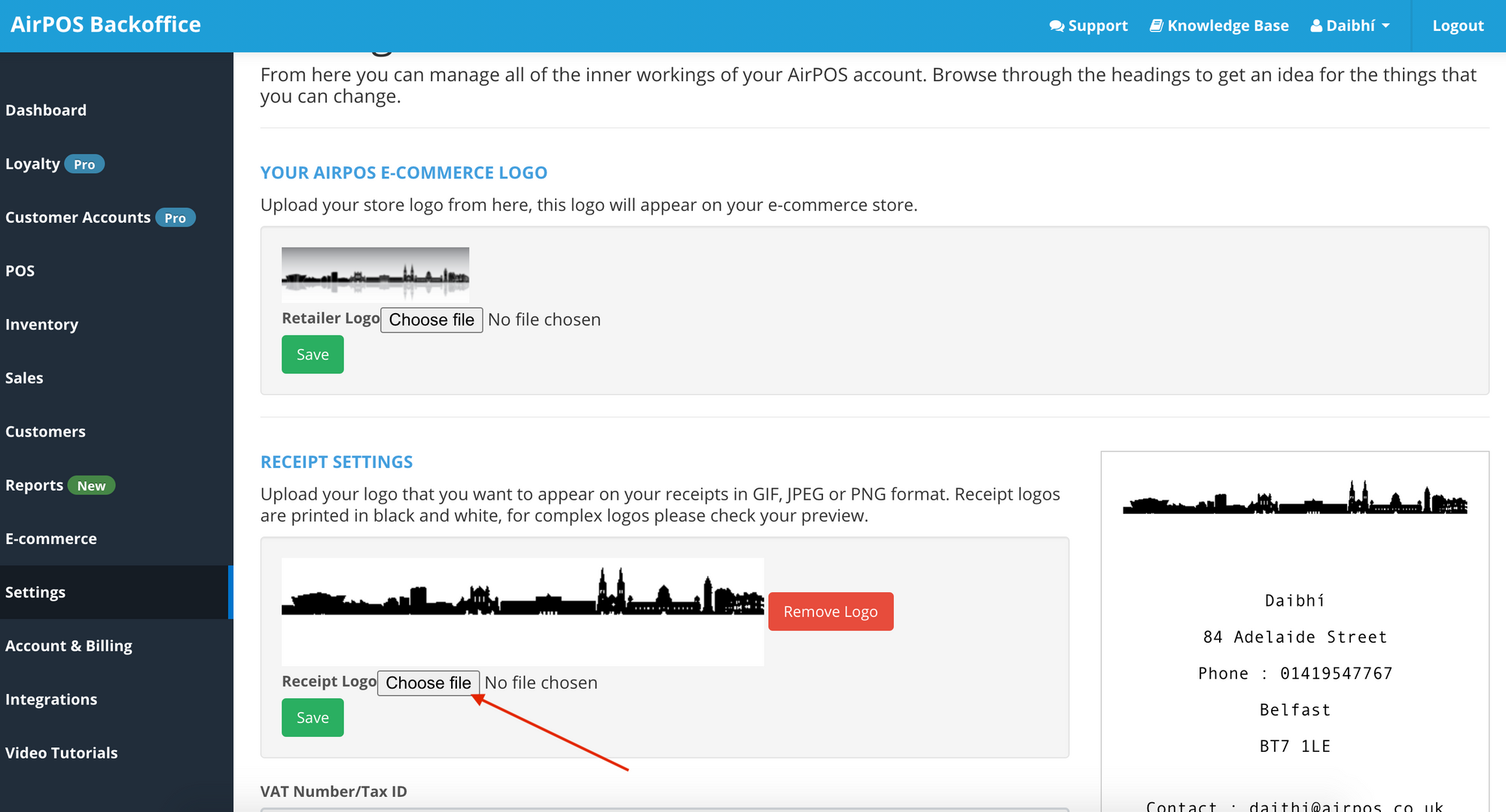 On an Android device or an iPad you can customise your receipt by adding a logo, a header and a footer. This is done by going into your settings in the left navigation panel of the AirPOS backoffice and uploading a suitable logo through the Receipt Settings dialogue.