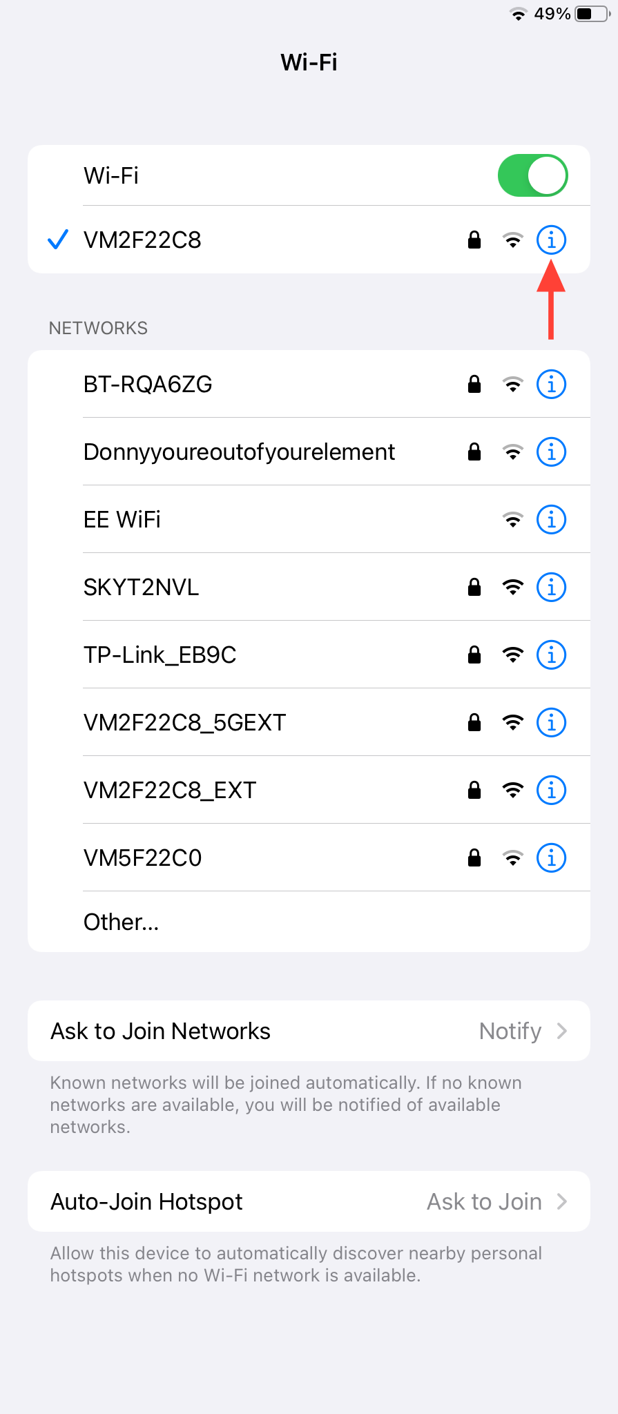 - Find and tap the ⓘ icon next to the Wi-Fi network you want to configure.