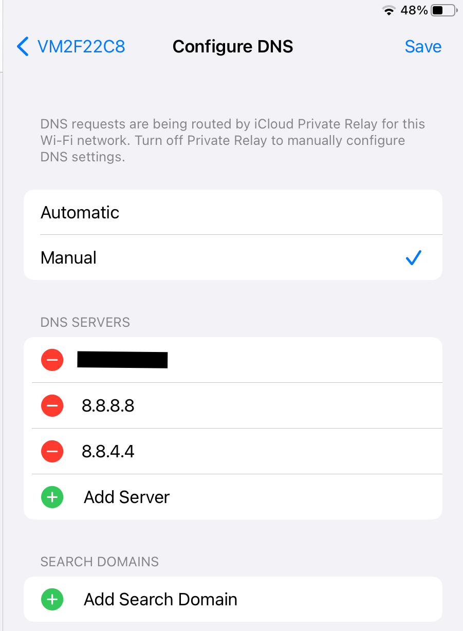 - Tap on "Add Server" and enter the Google DNS addresses: