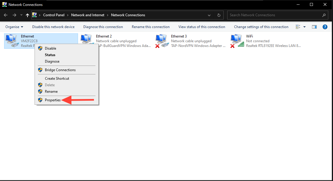 - Right-click on the specific connection (Ethernet or Wi-Fi) and choose "Properties."