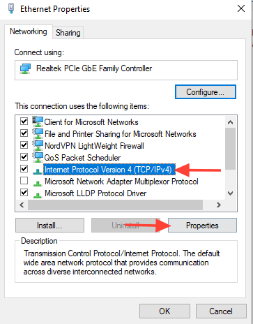 - In the properties window, find and select "Internet Protocol Version 4 (TCP/IPv4)" or "Internet Protocol Version 6 (TCP/IPv6)."