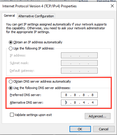 - For IPv4: Preferred DNS server - 8.8.8.8, Alternate DNS server - 8.8.4.4