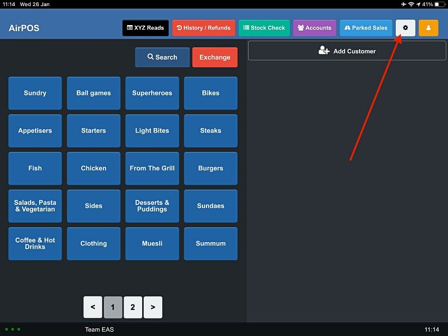 To access your peripheral settings tap or click on the settings cogwheel at the top of the POS screen.