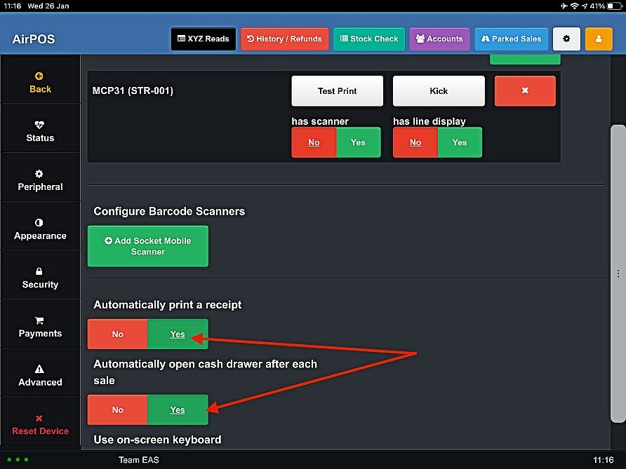 - If you want AirPOS to automatically open the cash drawer each time a sale is made, then make sure ‘Automatically Kick My Cash Drawer’ is selected as ‘Yes’.
