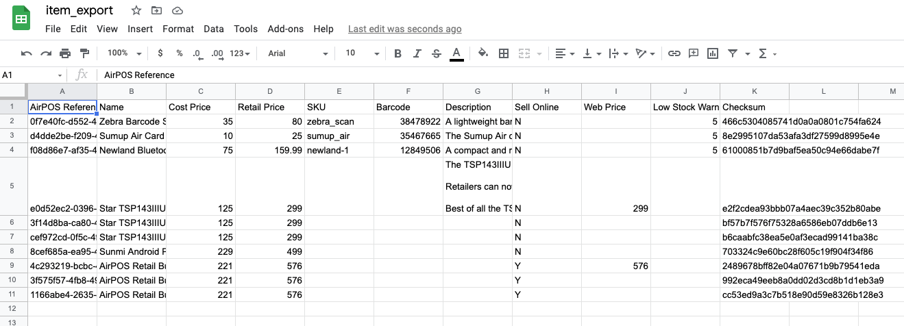 Note that it is ciritcal not to alter the template, not to add columns or to alter the AirPOS Reference or Checksum columns as the import will fail.