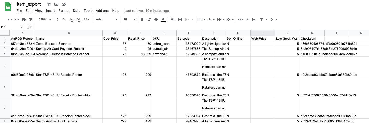 In our case we're going to add barcodes, change the low stock warning levels and descriptions for each of the items and then set the items to sell online by changing Sell Online from N (no) to Y (yes).