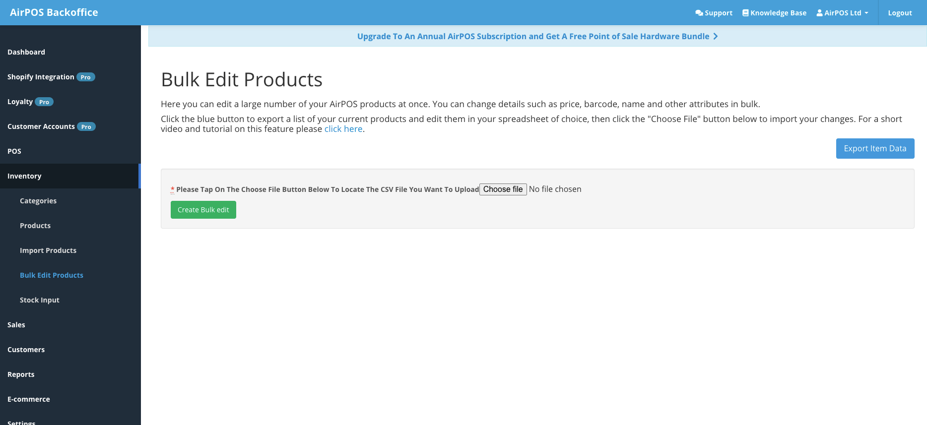 Under Inventory > Bulk Edit Products in the AirPOS backoffice you'll find the AirPOS bulk edit tool. This tool can be used to upload a CSV file to make changes to multiple products.