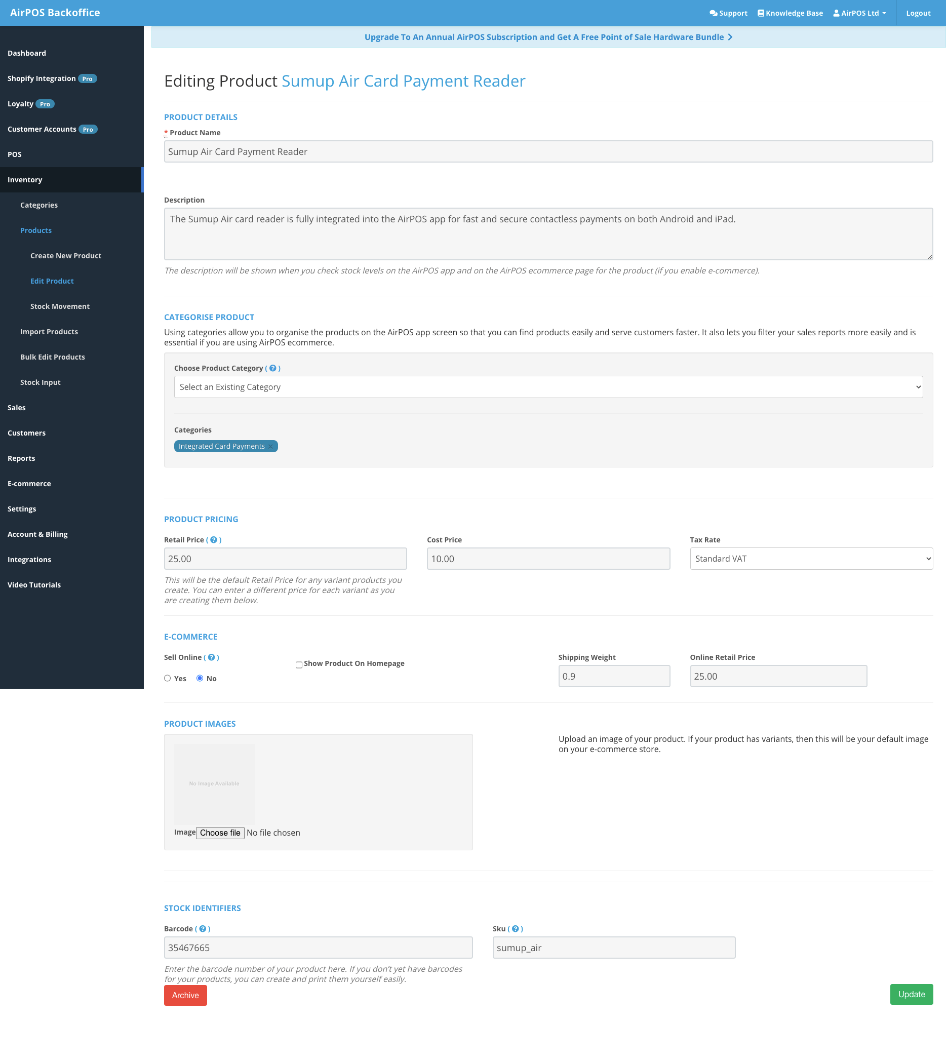 As you can see all of the essential information required to sell the product online is there and so it's a simple case of switching Sell Online from No to Yes and then pressing the Update button at the bottom of the screen to send this product to our Shopify store. We'll go ahead and do that.