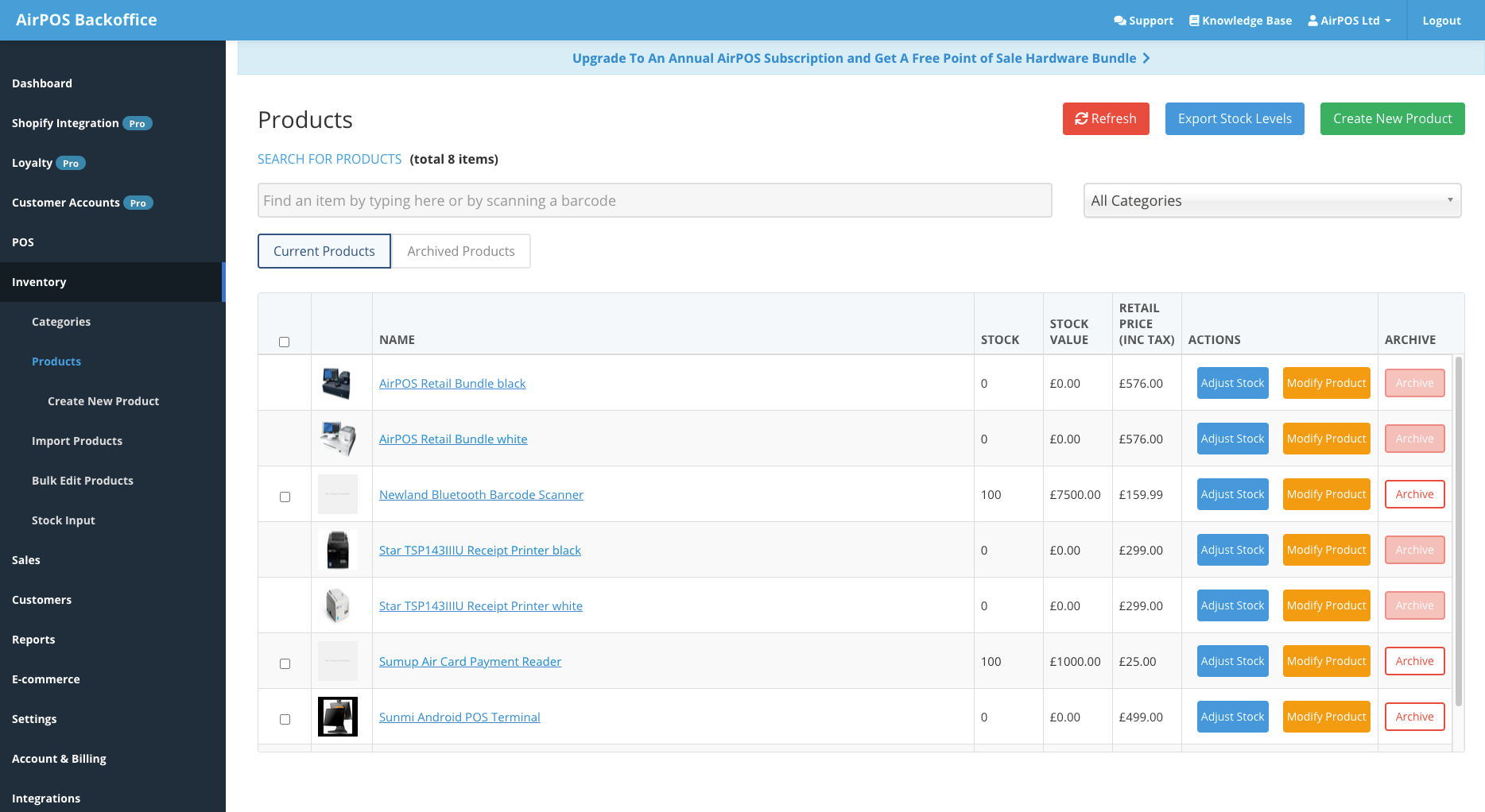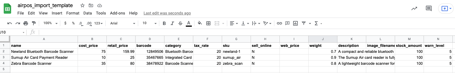 We're going to add a few items to the AirPOS Hardware store using the importer, including the Newland Barcode Scanner, the Sumup Air card reader and It is critical not to change the headers in the AirPOS import template. Note also that you should not add columns to the template, in order for it to work successfully it must be kept in our standard format. If you change the template layout your import will fail.
