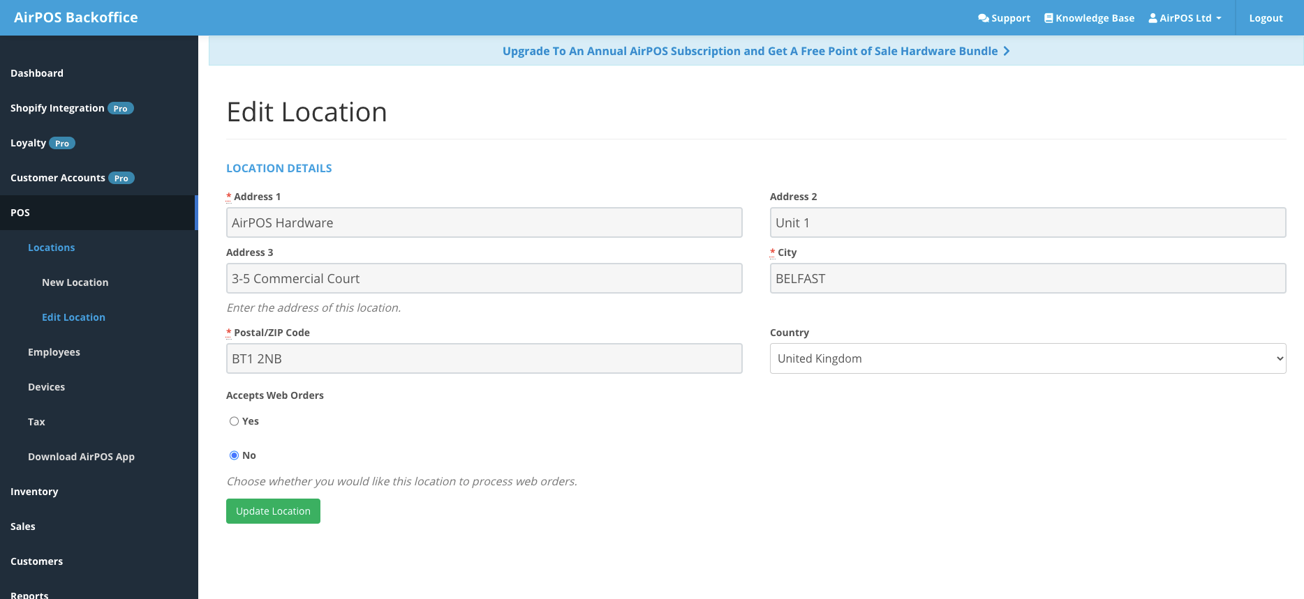 In the form below change the selection under Accepts Web Orders from 'No' to 'Yes' and press the Update Location button.