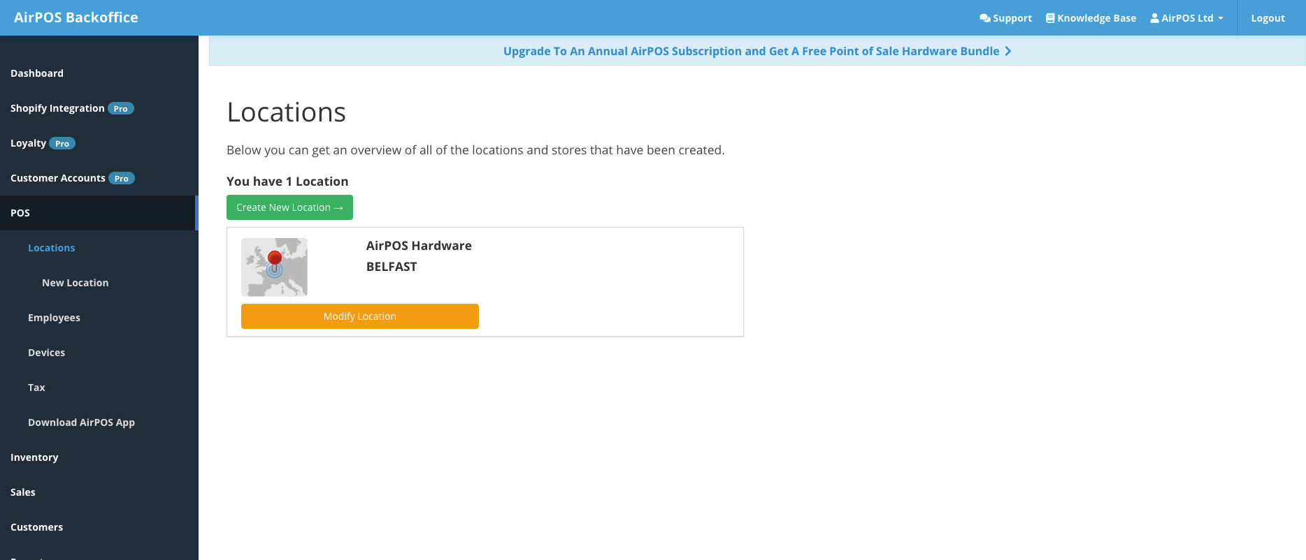 To get started click on POS > Locations in the AirPOS backoffice. You'll see a screen similar to that below