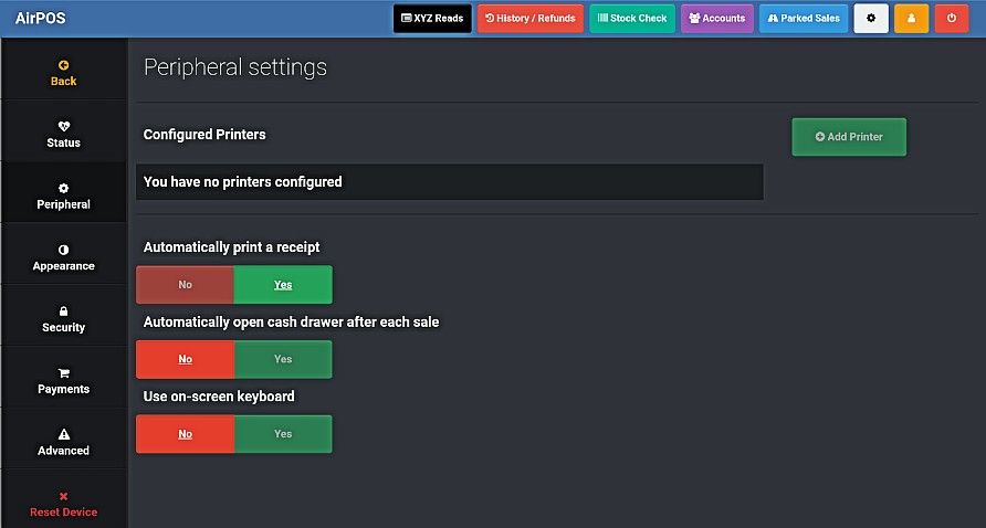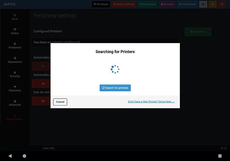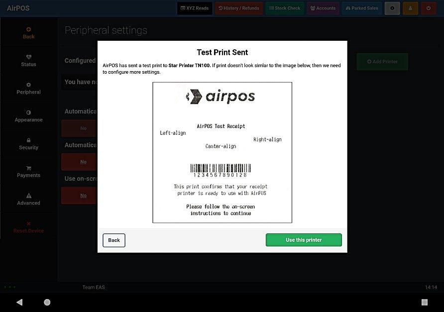 Now that the printer is paired with your tablet it just needs to be configured within AirPOS. Go into your settings in the AirPOS POS app by clicking on the grey cogwheel icon at the top right of the screen. Select ‘Peripherals’ from the left navigation panel and you will see the peripherals settings screen. Next tap on the green ‘Add Printer’ button beside configured printers.