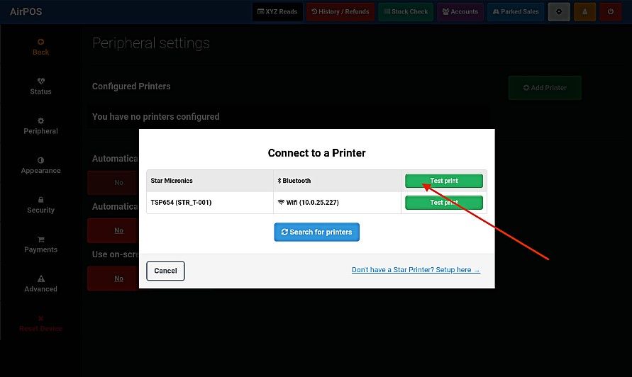 After a few moments any available Star printers will be listed. Tap on the 'Test Print' button to the right of 'Star Micronics Bluetooth'.