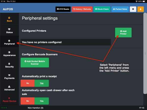 From the left margin select 'Peripheral' and then tap on the green 'Add Printer' button as seen in the screenshot below.