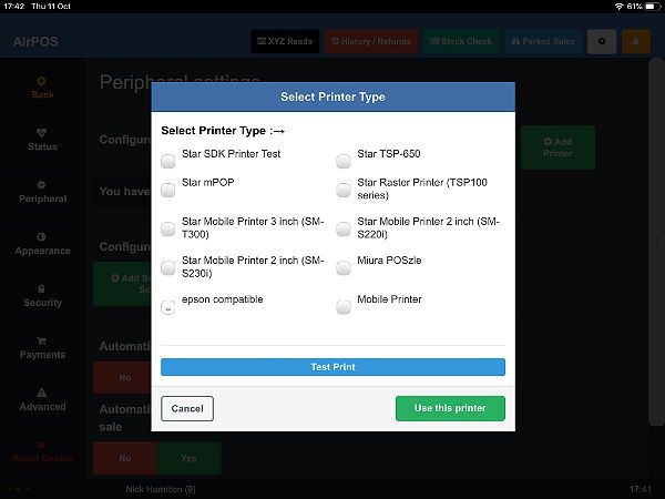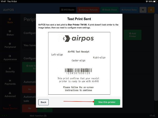 Just tap on the green 'Use this Printer' button and that's your Star Printer configured for use with AirPOS on your iPad.