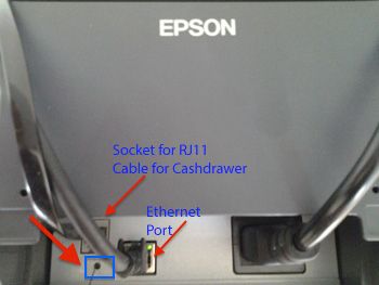 In the case of an Epson network printer we'll add an 'Epson TM-T20'. The IP Address is 192.168.0.177 and we obtained this by inserting a pin into the pinhole at the back of the printer just below the ethernet port with the red arrow in the image below.