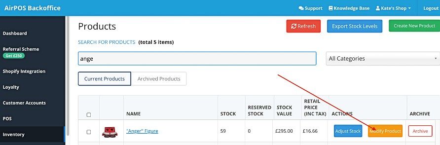 Individually, item by item. To do it this way click or tap on 'Inventory' from the left margin of your backoffice and scroll through your product list or search for the item you wish to add an image for or search for it be product name or barcode in the search box at the top of the inventory screen. To the right of the item you'll see an orange 'Modify Item' button. Tap on that and scroll down form to the 'Item Images' section.