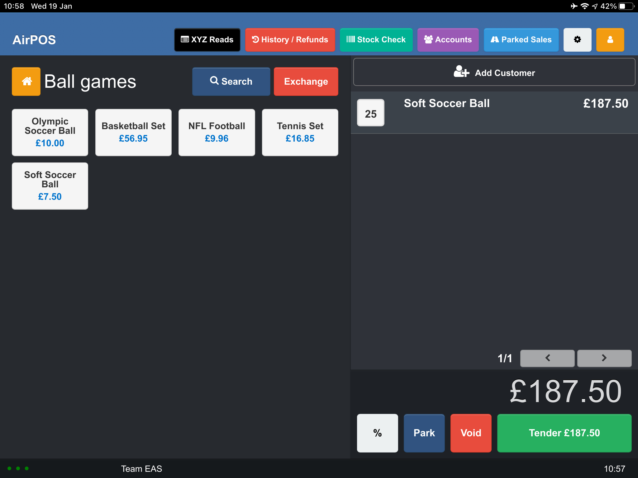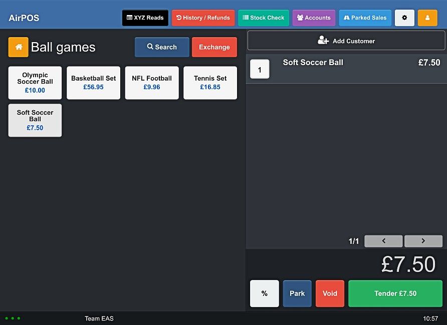 Ordinarily adding multiple quantities of an item is done by increments of 1 by just tapping on the product name again but this is painful when dealing with an order for something like a pallet of 500 bricks. On the POS when an item appears in the cart the number of the item in the order is shown to the left in a white box as shown below.