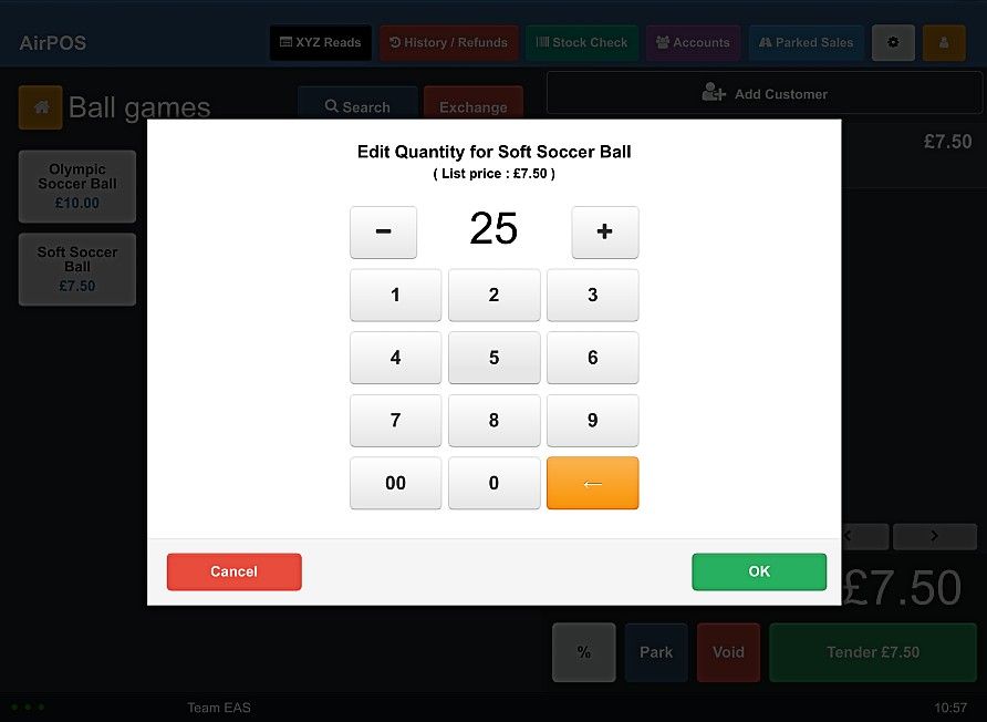 Simply tap the plus (+) or minus (-) button to change the amount by one or simply use the keypad to enter the quantity required and press 'OK' as shown below.