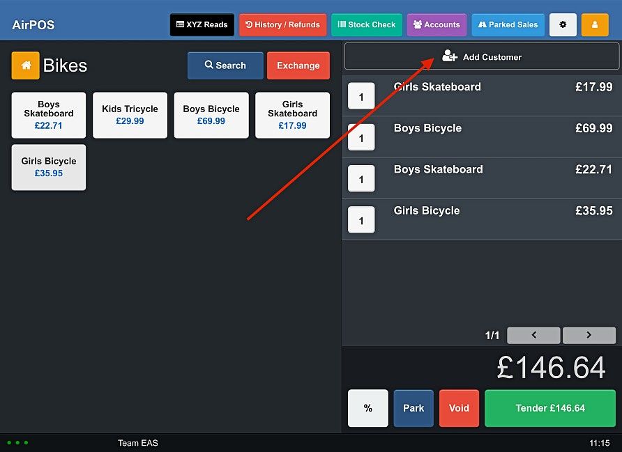 You can easily create new customers on the POS and attach sales to existing ones. To add a customer / attach a customer to a sale, simply click the ‘add customer’ button at the top of the cart on the tender screen.