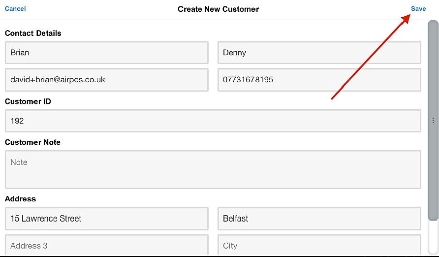 The screen will refresh with a form to capture your customers details. When completed press the 'Save' button at the top right and the new customer will be assigned to the transaction.