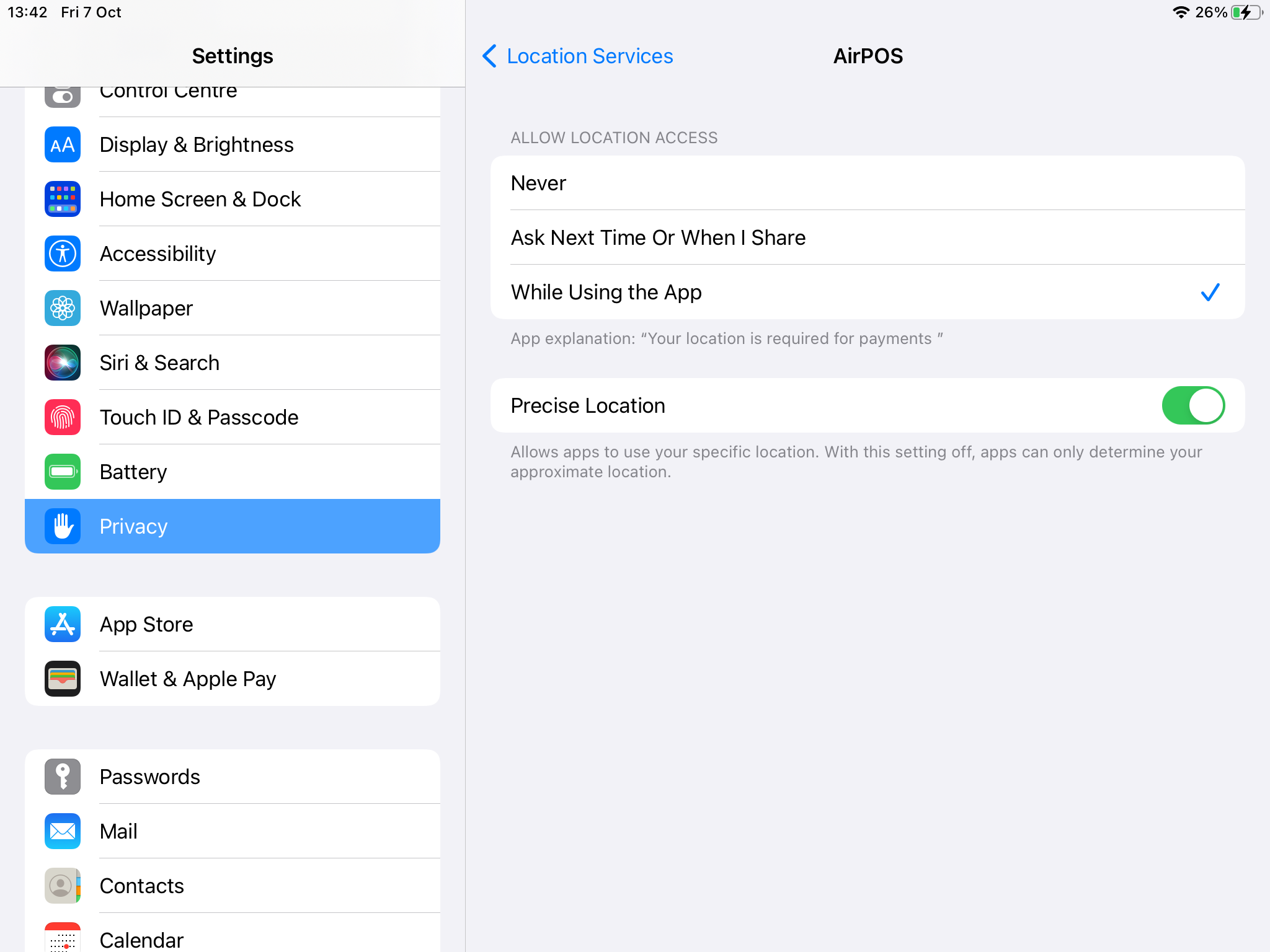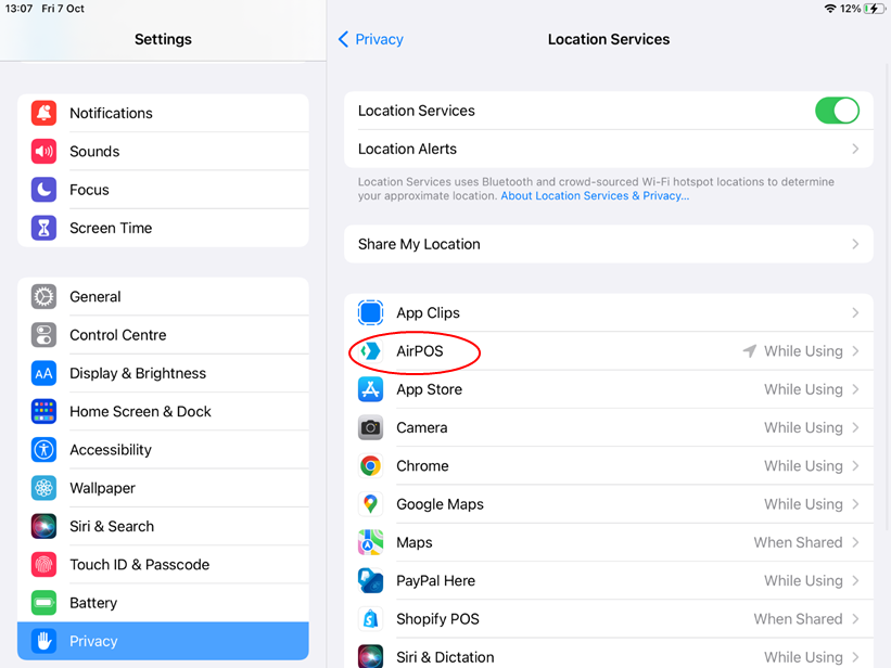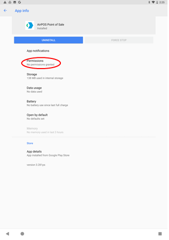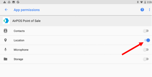 - On this page you will see all the permissions that an app may require. For AirPOS to work correctly on your device we require that your location permission is turned on, other wise it may lead to the crashes that some customers have been experiencing.