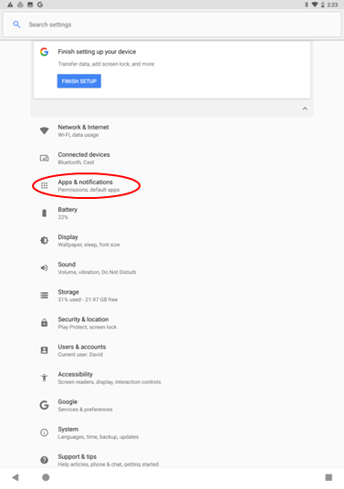 - Once your settings menu has been opened open your 'Apps & Notifications' which you can see circled below.