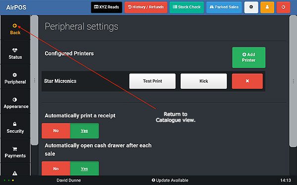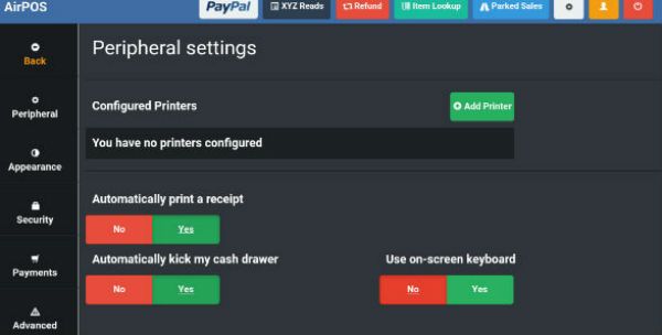Having put the printer into the correct mode for Android (Bluetooth Mode) and paired it with the tablet the next step is to configure the printer in AirPOS. Open the AirPOS App and click on the settings icon (cogwheel) at the top right of the POS screen. From the left margin select Peripheral and press the green 'Add Printer' button as shown below.
