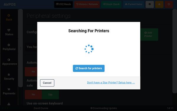 The AirPOS application will start searching for all nearby available Star printers and your screen will look like the image below.