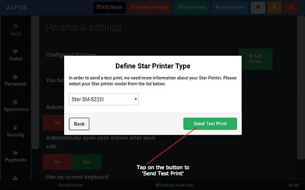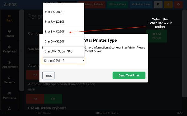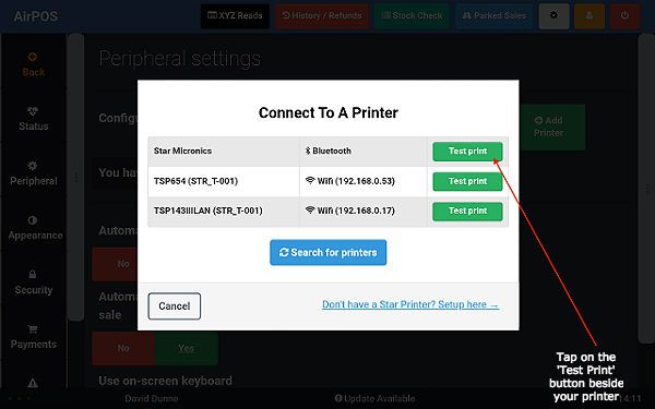 Tap on the test print button to the right of 'Star Micronics'. You'll be prompted to select your printer from a dropdown list.