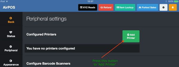 Plug the lightning cable into the iPad and the USB end into the left port ( 1 above ). Make sure that the charging symbol at the top right of your iPad is green signifying that the printer is connected. The next step is to configure the printer in AirPOS. Open the AirPOS application and tap on the settings cogwheel at the top of the screen. Select 'Peripherals' from the left margin. Press the 'Add Printer' button in your peripheral settings as shown below.