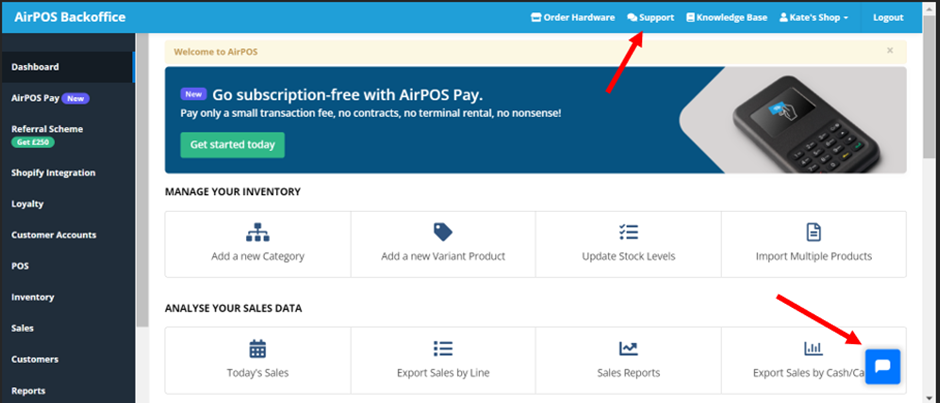 If you are somehow unable to access the chat bubble, that's not a problem! You can also contact support through email by sending your message to support@airpos.co.uk.