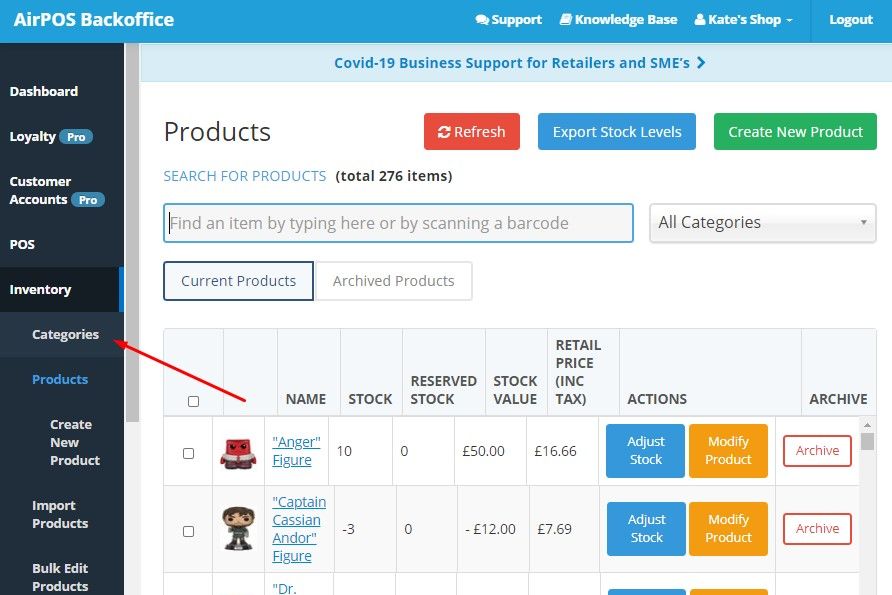 AirPOS employs an open approach to creating product catalogs in that it is possible to create an unlimited amount of categories and subcategories in your inventory.