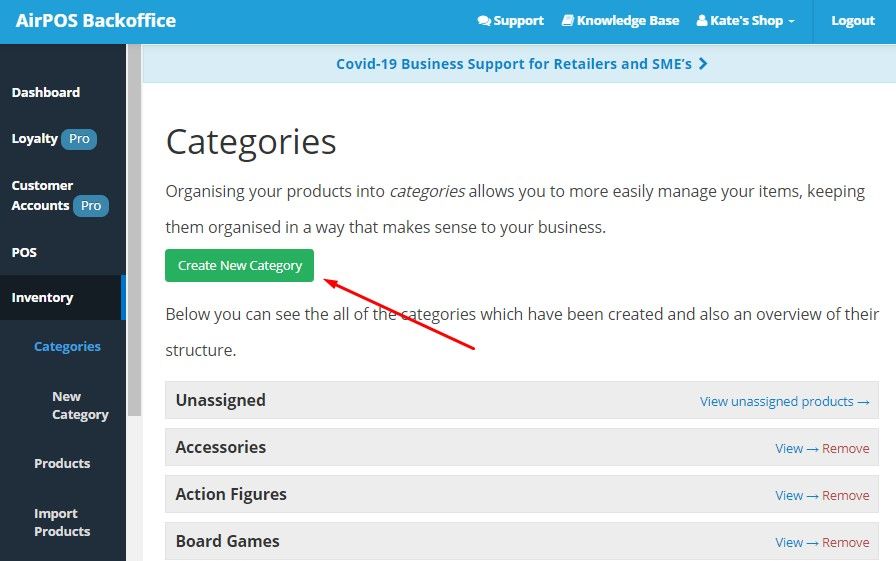 Your categories will appear on the POS screen and your items will be located within those. If an item is unassigned to a category it will only be visible after a product search. Your categories are therefore important and you should give some thought as to how you wish to categorise your inventory. You can create categories and subcategories in the backoffice by clicking on the 'Categories' tab under 'Inventory' in the left margin of the backoffice as shown below.