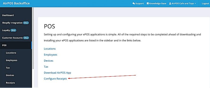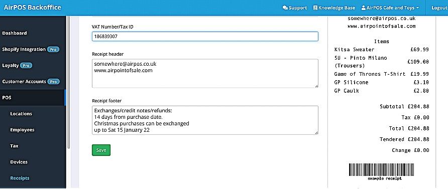 Your receipt settings are located in your backoffice under 'POS' from the menu in the left navigation. This is where you can add a company logo for your receipts, your VAT registration number if you are registered, your contact details and your returns policy.