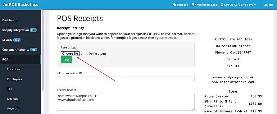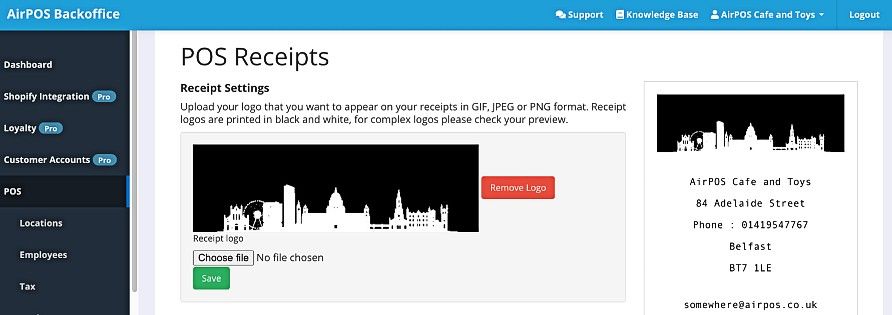 Your logo can be in GIF, JPEG or PNG format and while it will be resized you should try to limit the size of the uploaded image. 450 to 700 pixels in width is a good size. Receipt logos are printed in black and white and will be previewed in this screen when uploaded. Press the 'Choose file' button as shown above and select your logo image from your computer and press the green 'Save' button. You'll see a preview of your logo on the right.