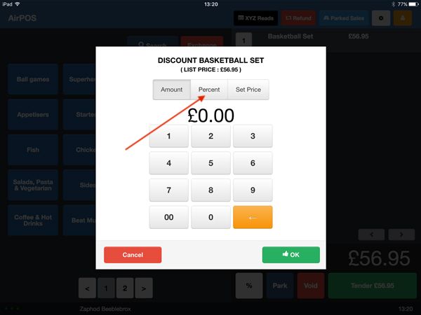 - Press the Percent button at the top of the keypad and type in the percentage amount you would like to discount the item by (eg 5%)