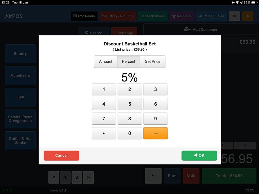 - Press the Amount button at the top of the keypad and type in the Set Amount you would like to discount the item by (eg £6.95)