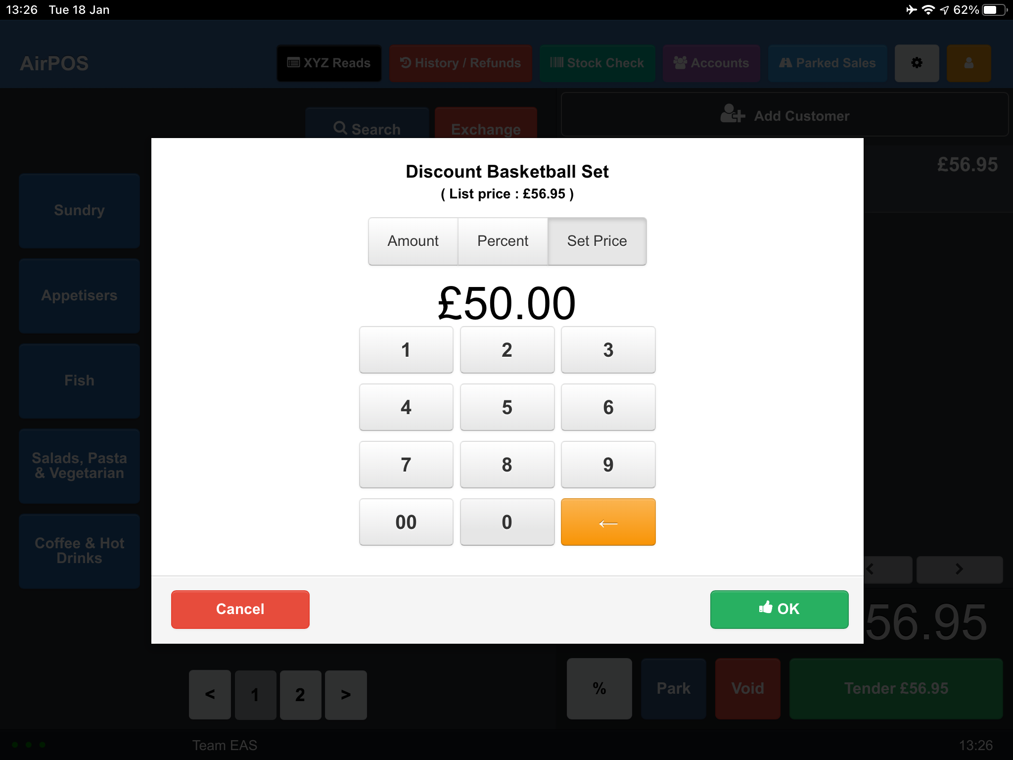 - Press the Set Price button at the top of the keypad and type in the price you would like the item to now be (eg £50.00)