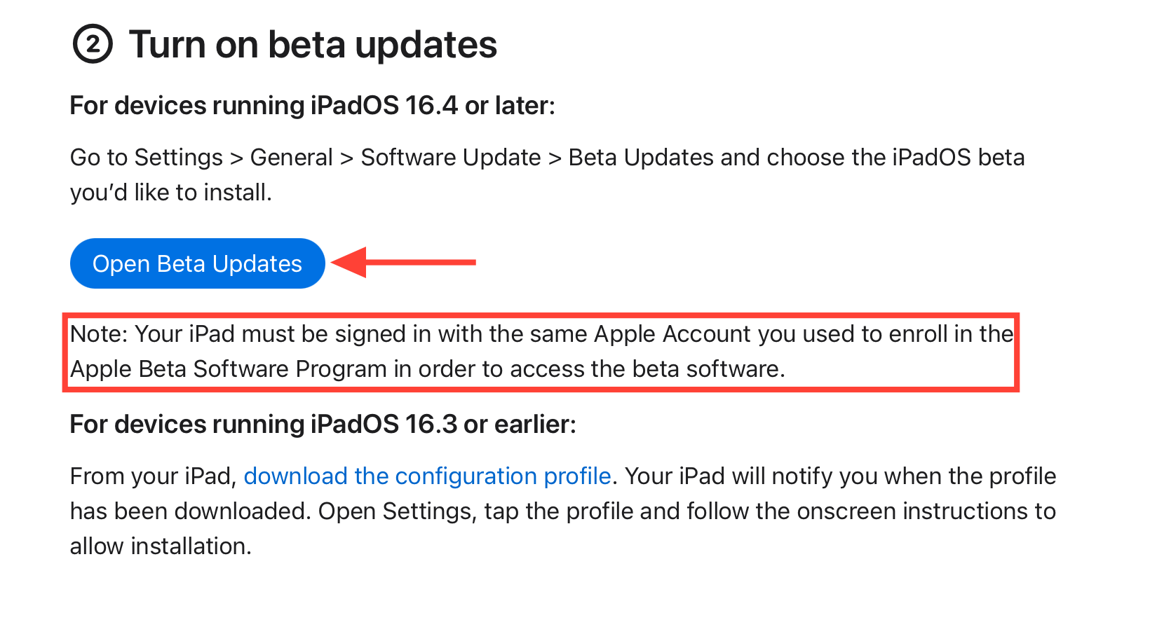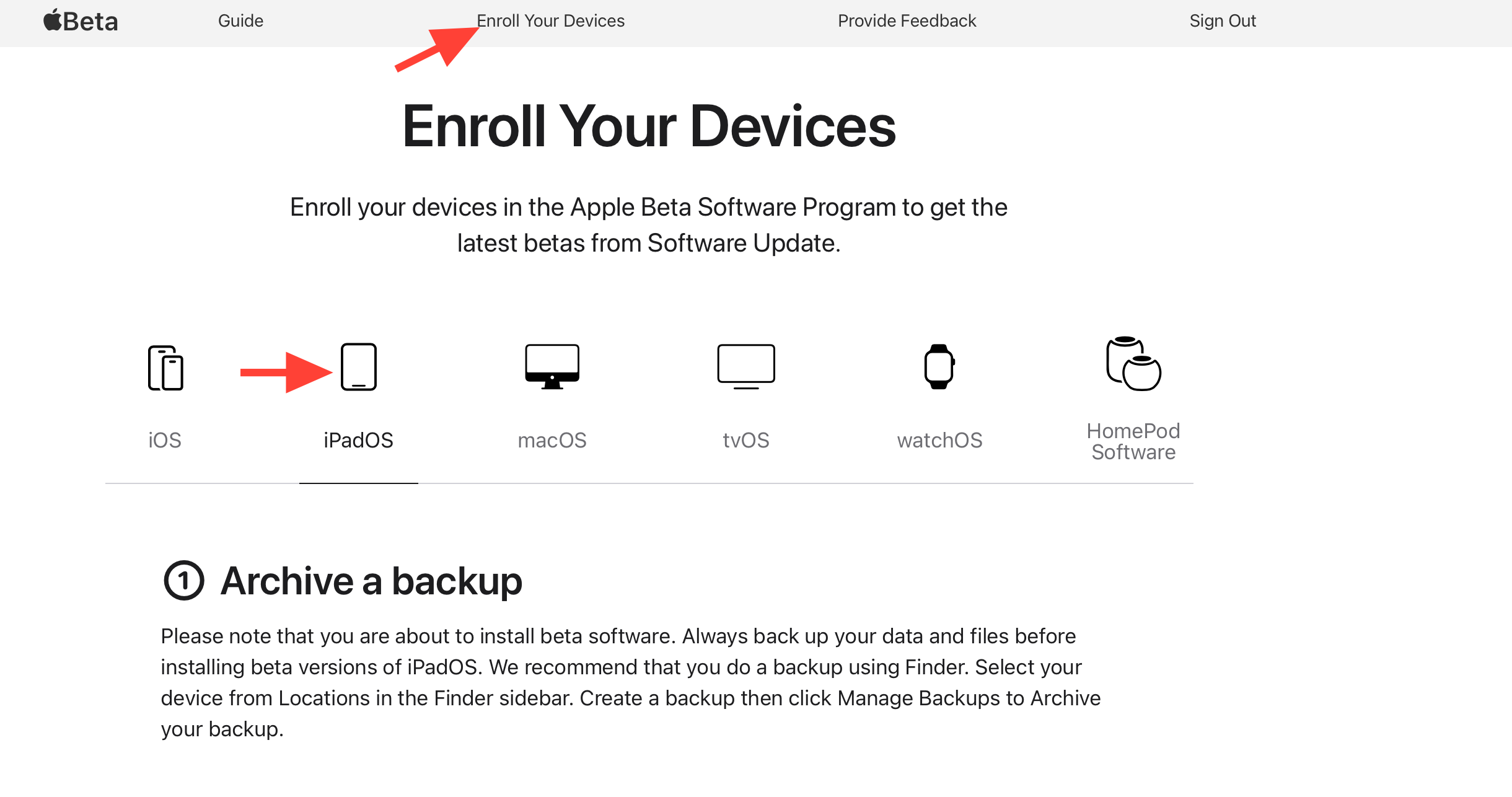 On your iPad, navigate to the Enroll Your Devices section of the Apple Beta Software Program.