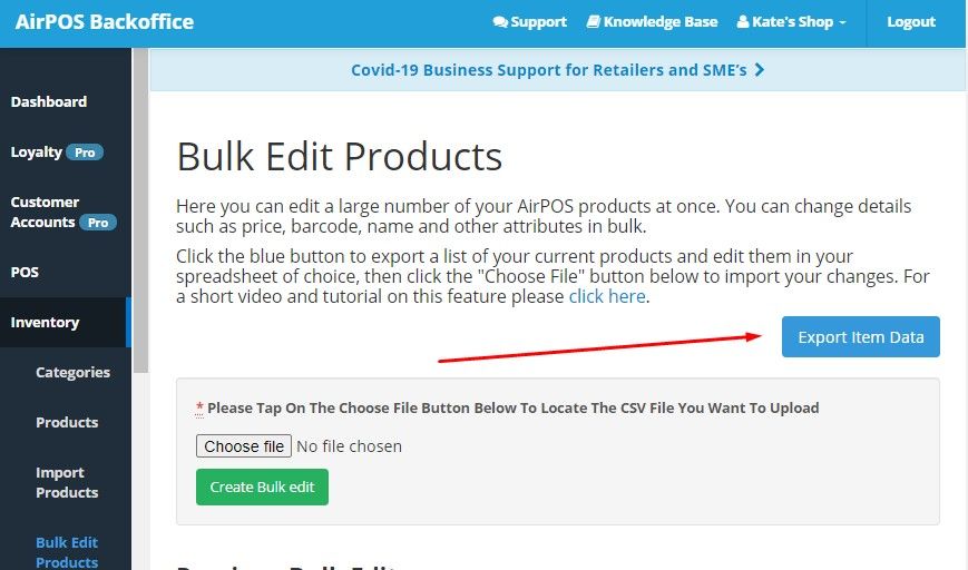 When you tap or click on that you'll be brought into the 'Bulk Edit Items' screen. From there, in the top right you'll see a button to 'Export Item Data'. When you press that your inventory will be downloaded as a .CSV file which you can open and edit in any spreadsheet programme or upload to Google Sheets if you use online programmes. Please note that each time you want to perform bulk edits you will need to download this CSV as item's properties may have been changed through the backoffice and your new export needs to reflect these changes. Also it is not good practice to be using the backoffice to manually update items for example whilst performing a bulk edit at the same time.