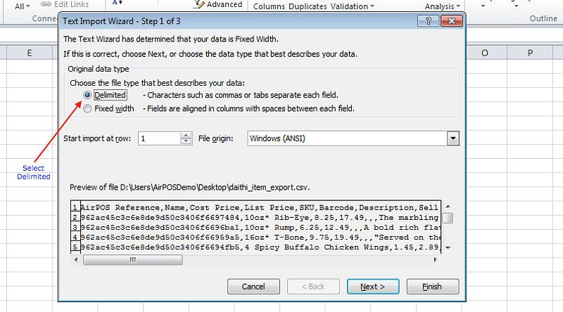 - 4. Microsoft will prompt you to select what type of data file it is. Select 'delimited', then click 'next'