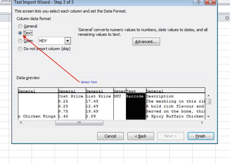 - 6. Next navigate to and highlight the Barcode column, change the Column data format to text and then click 'Finish'.