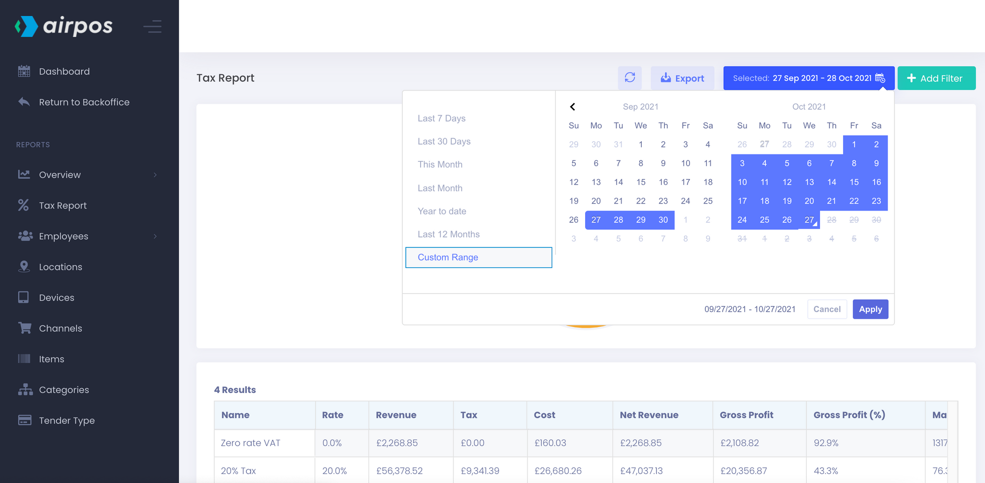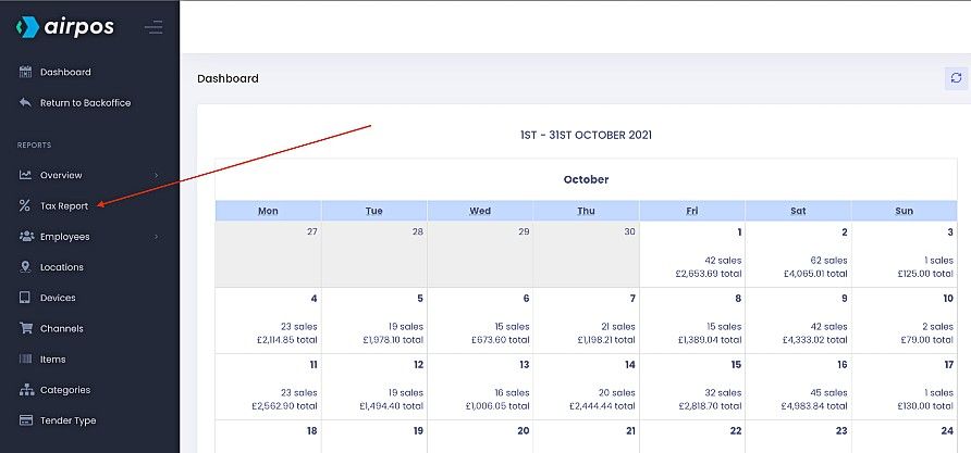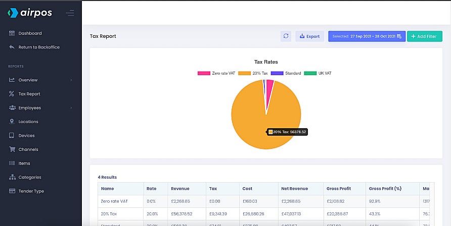 Among the many reports you can run with the advanced reporting suite is the tax report. This features a pie chart showing all the tax rates that you have set up in the backoffice.