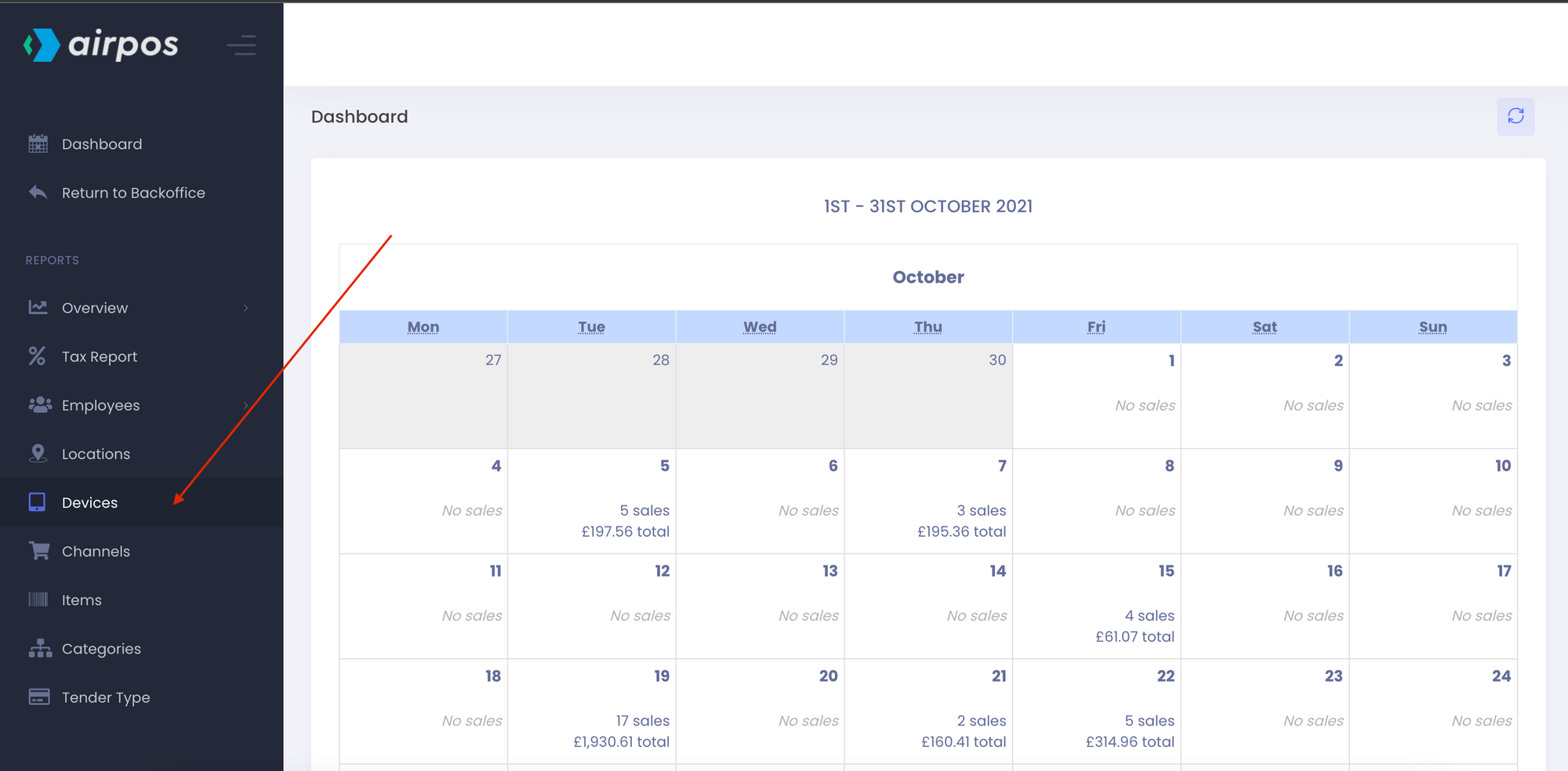 You can view your sales by device by selecting ‘Reports’ from the left navigation panel of the backoffice. This will present you with a calendar view of the current month's sales.
